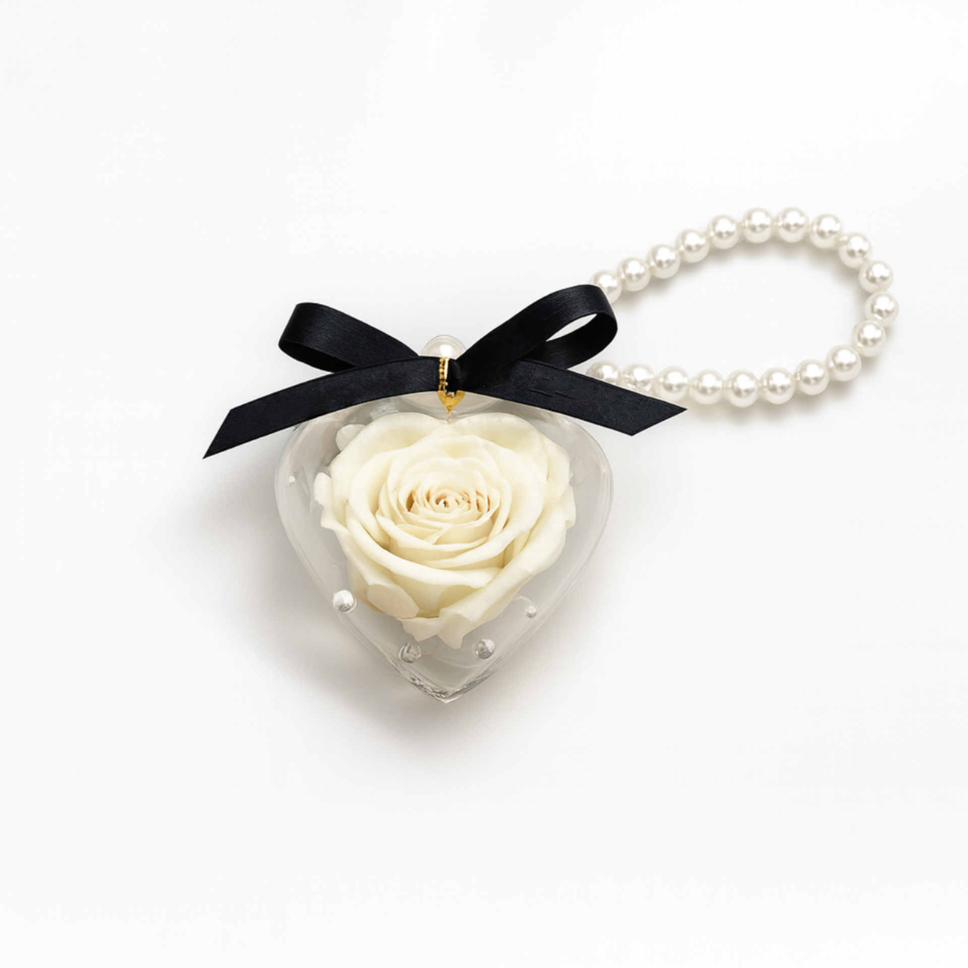 A symbol of love in the palm of your hand. The Heart Bloom Keychain features a naturally preserved rose encased in a crystal-clear heart-shaped charm, accented with soft faux pearls and a sleek satin black ribbon. The pearl-beaded loop adds a classic touch, creating a portable keepsake that blends romance with sophistication.