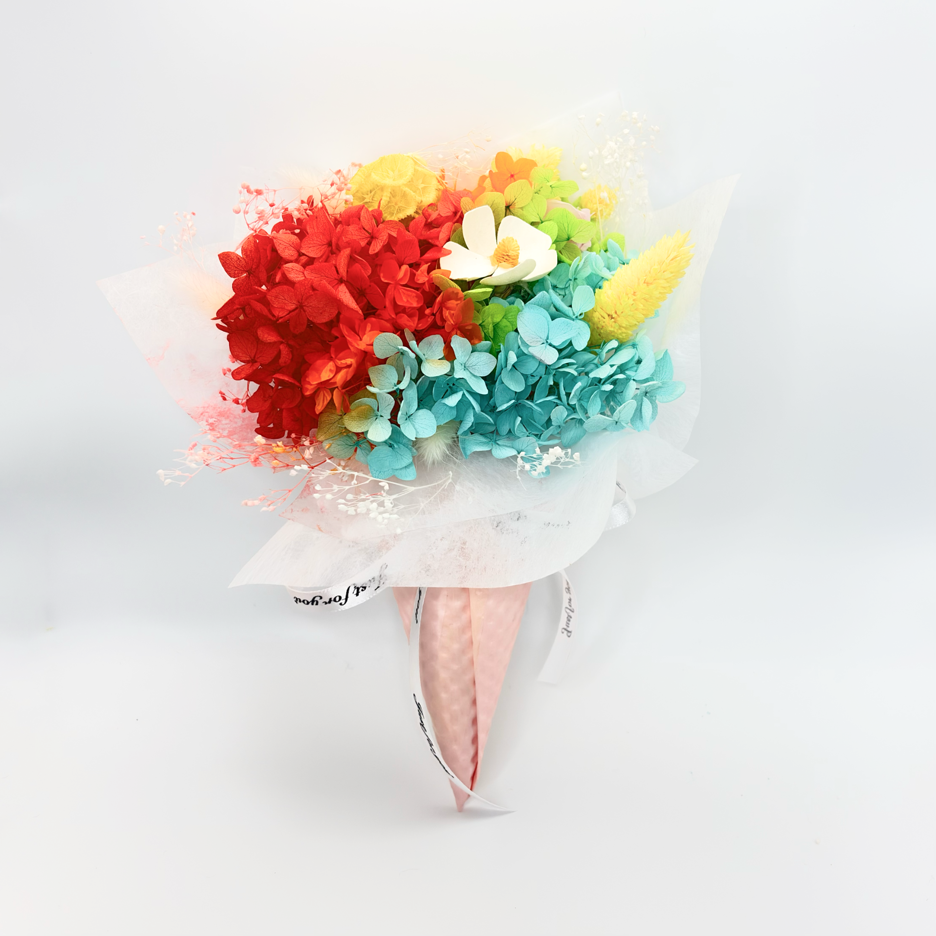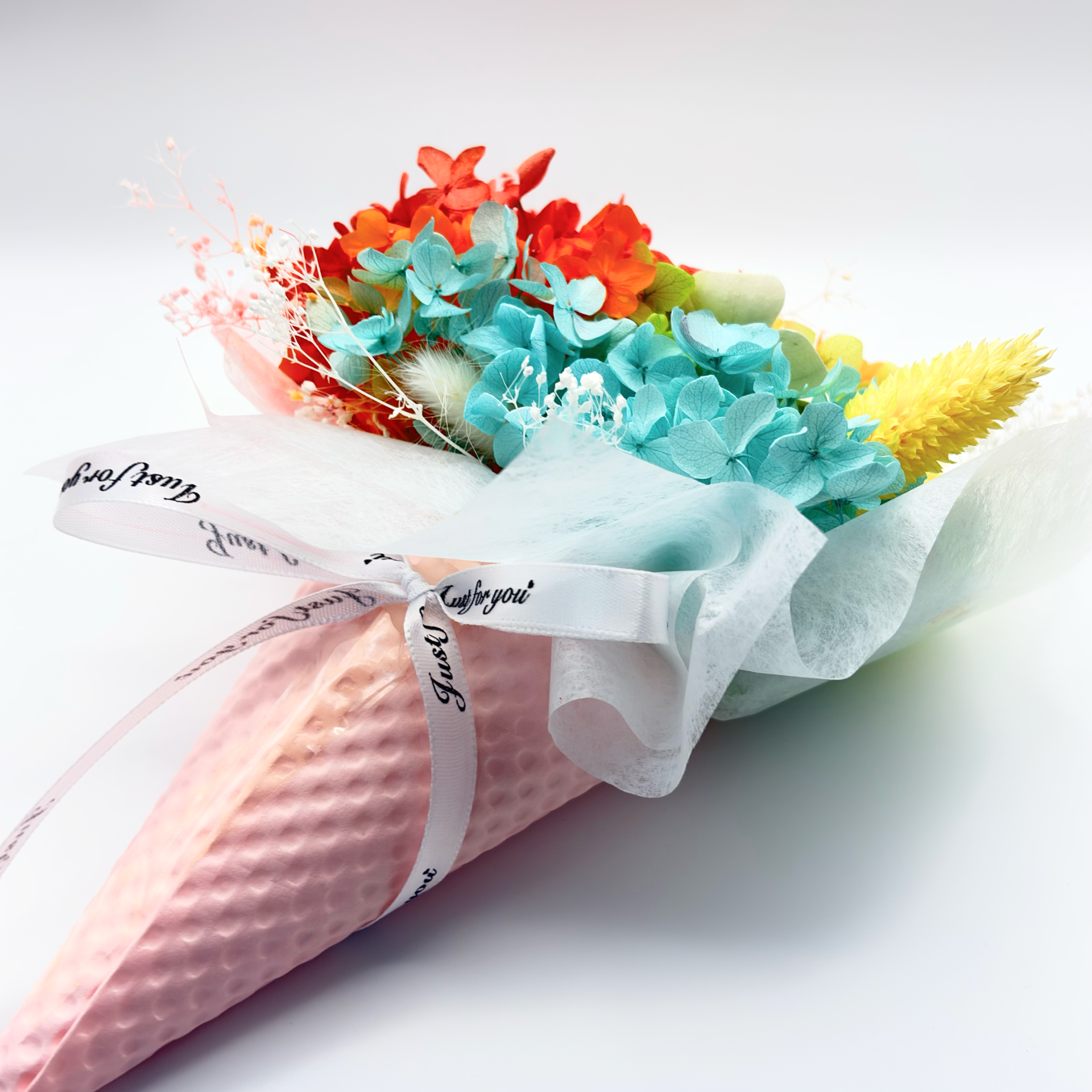 • Pink-toned preserved hydrangea matching the cone wrapping