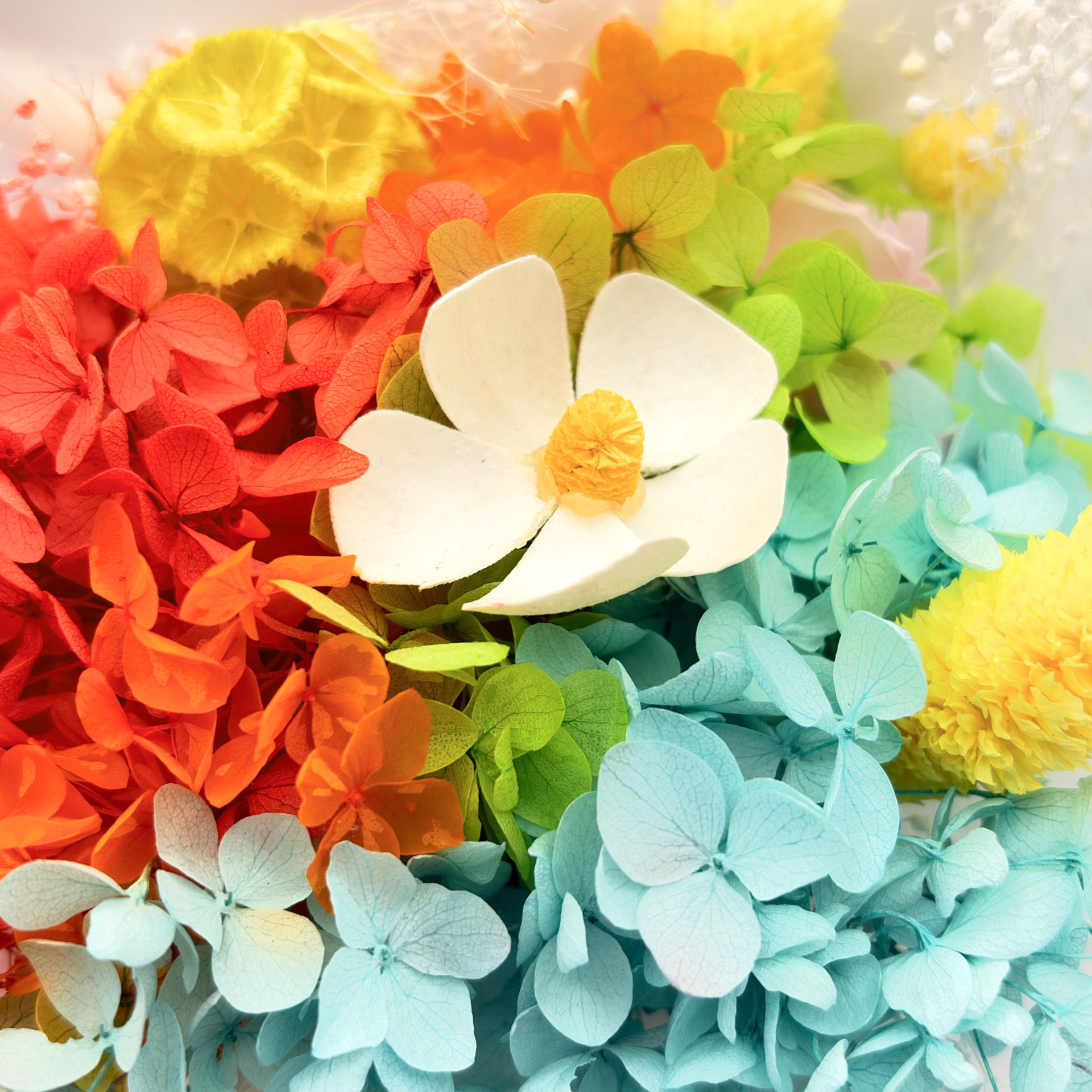 All preserved flowers are real botanicals, treated through an eco-safe preservation process and finished with food-grade, non-toxic dyes to enhance or restore their natural tones.