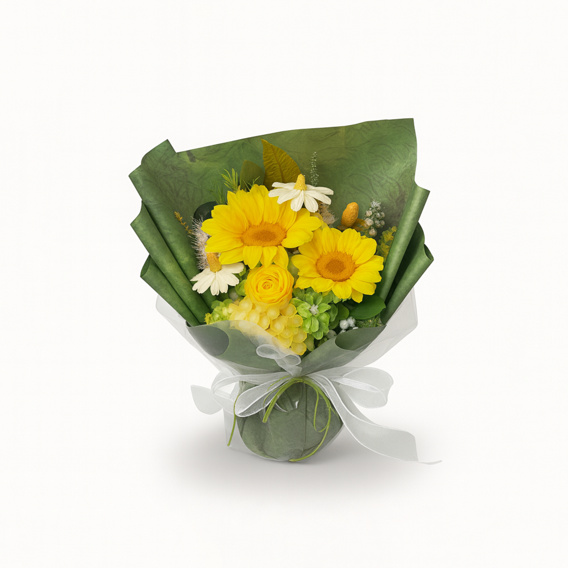 Bring sunshine home with Sunny Day, a 100% handcrafted preserved flower bouquet by ZESO Blooms. Featuring radiant sunflowers, a golden yellow rose, soft white daisies, and green hydrangea, it delivers natural warmth and optimism. Every bloom is real and eco-preserved to last 2–5 years — no water, no sunlight, just enduring beauty.
